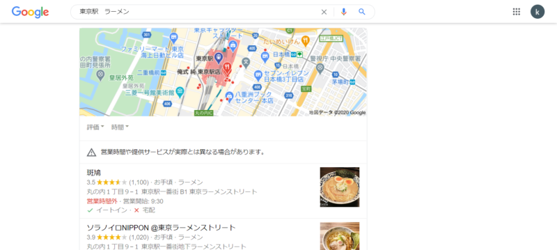 グーグルマップでの検索はもちろん、通常の検索でも下記のように表示が一番上に出ます。