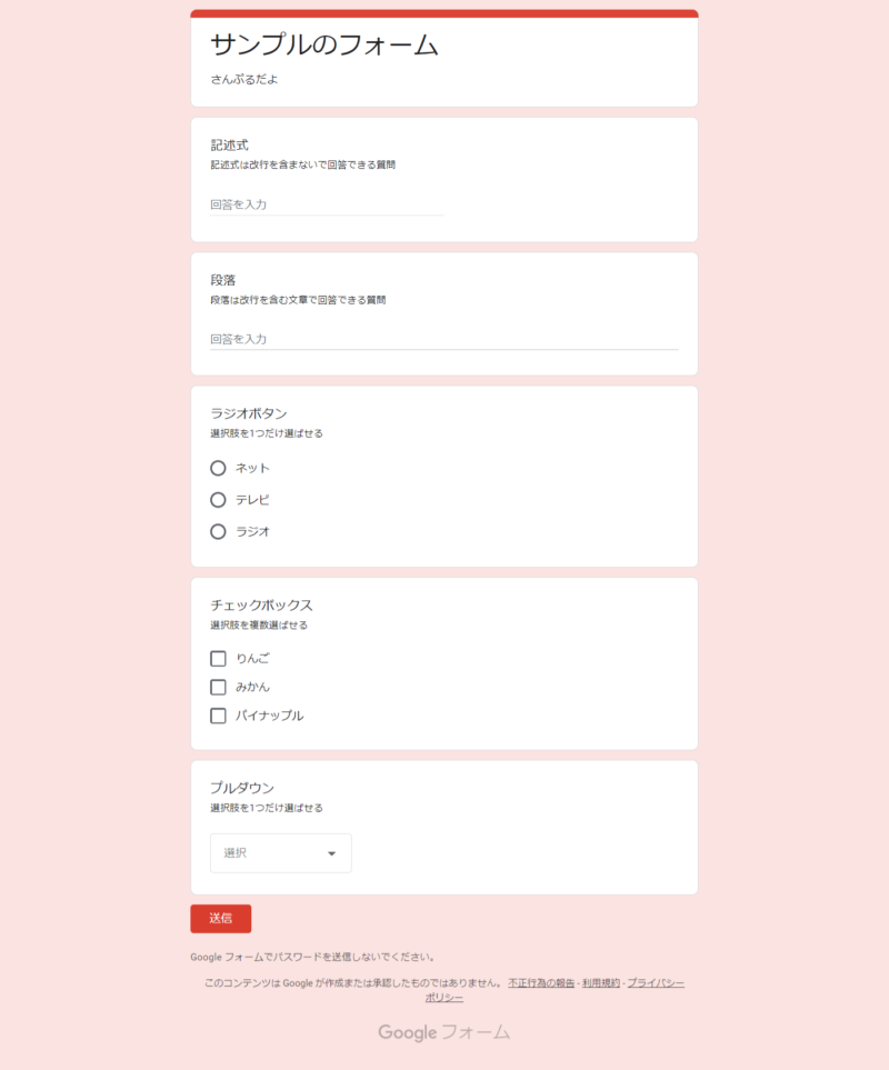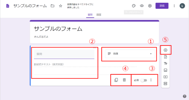 ※よく使う「入力タイプ」は、記述式、段落、ラジオボタン、チェックボックス、プルダウンとなります。